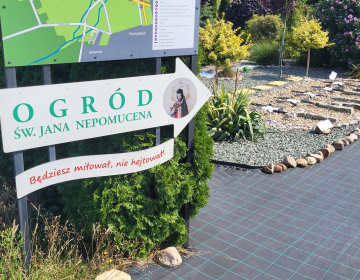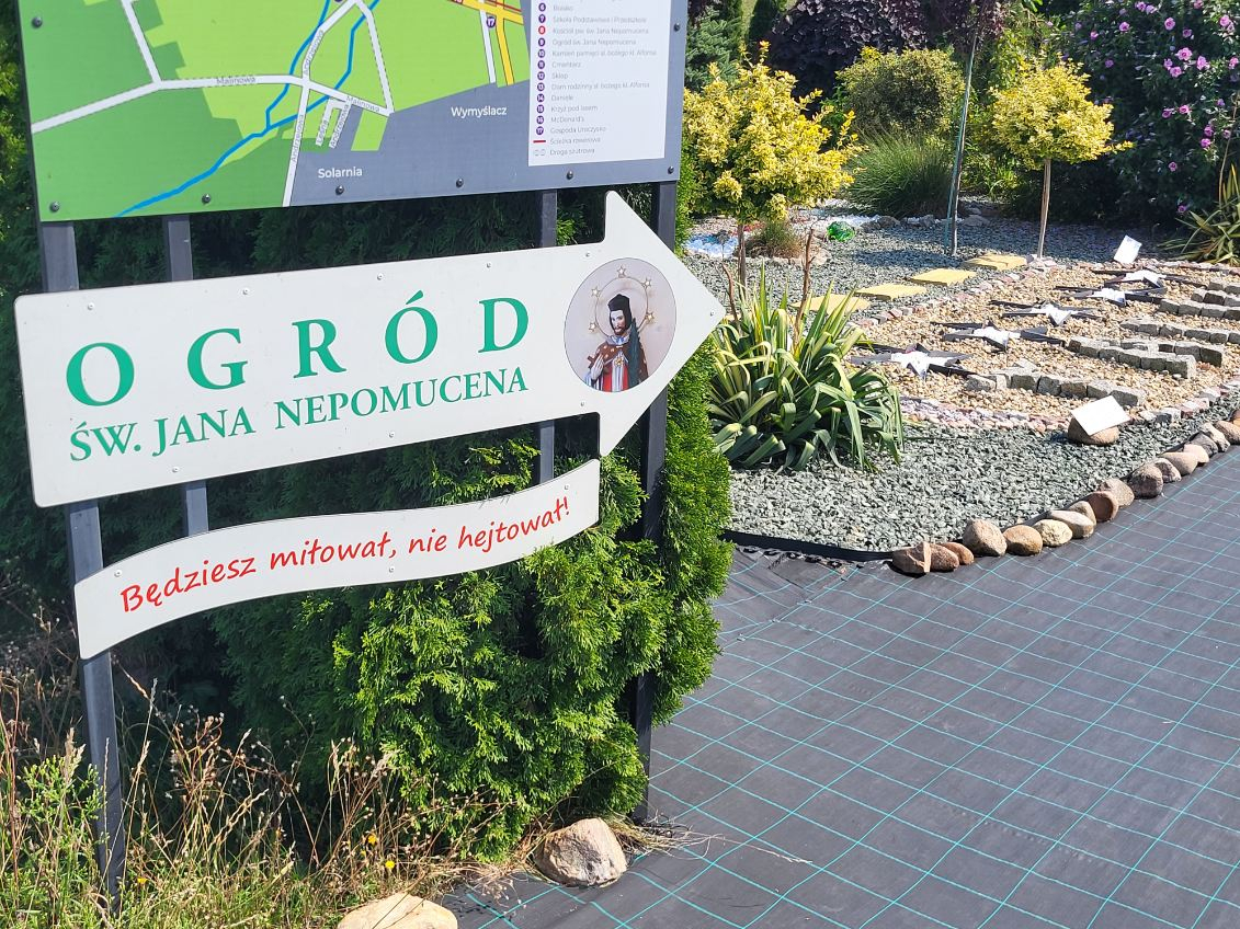 Za kościelnymi zabudowaniami mieści się ogród Św. Jana Nepomucena. Piękno natury i urok ogrodu mają skupić uwagę i przyciągnąć zwiedzających, jednak sam ogród stanowi jedynie tło dla - jakże istotnego – jego przesłania: "Będziesz miłował. Nie hejtował!". Licznie rozmieszczone w ogrodzie tabliczki z cytatami i sentencjami nt. dobrego i odpowiedzialnego używania mowy mają stanowić bodziec do refleksji nad świadomym wypowiadaniem słów.