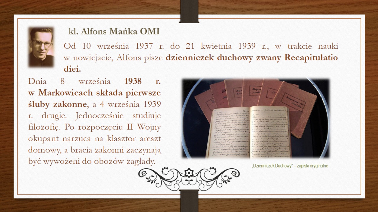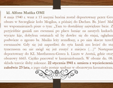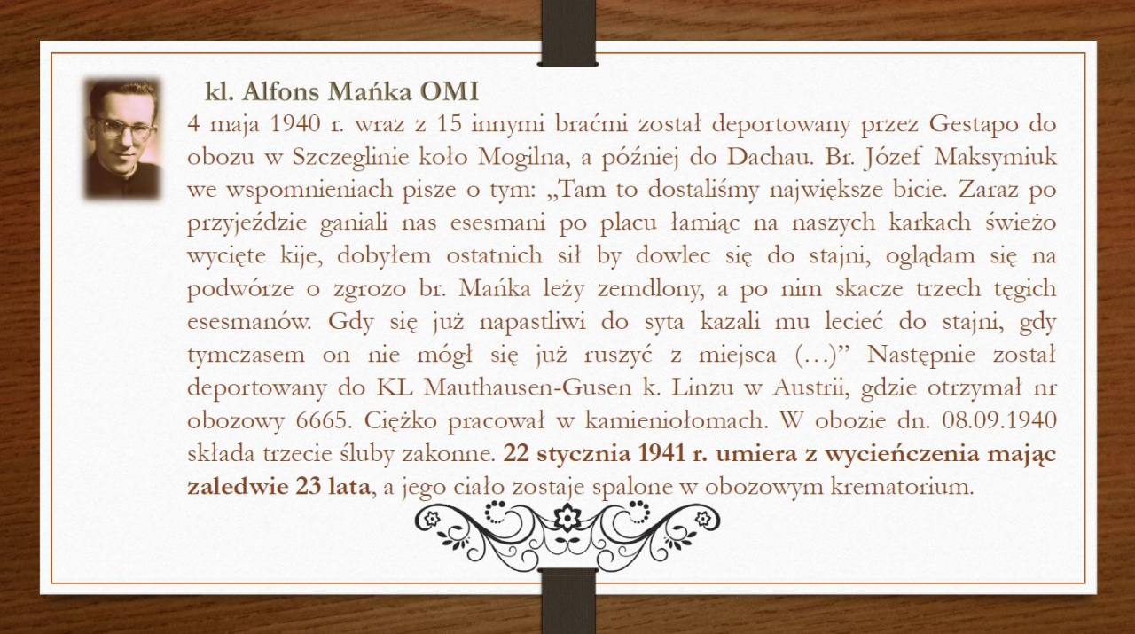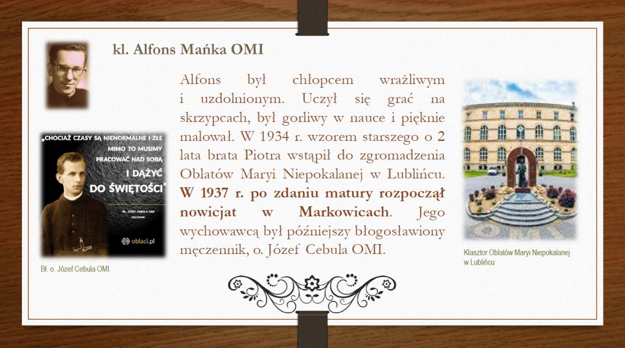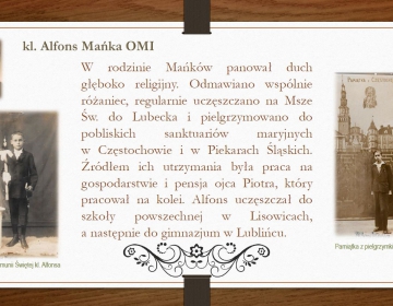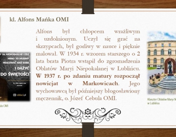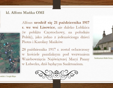 Krótki życiorys - prezentacja. Wszelkie informacje nt. śp. kleryka Alfonsa Mańki OMI znajdują się na stronie internetowej https://manka.oblaci.pl Pliki do pobrania Prezentacja o kl. Alfonsie Mańce (12 slajdów) - pobierz Galeria zdjęć